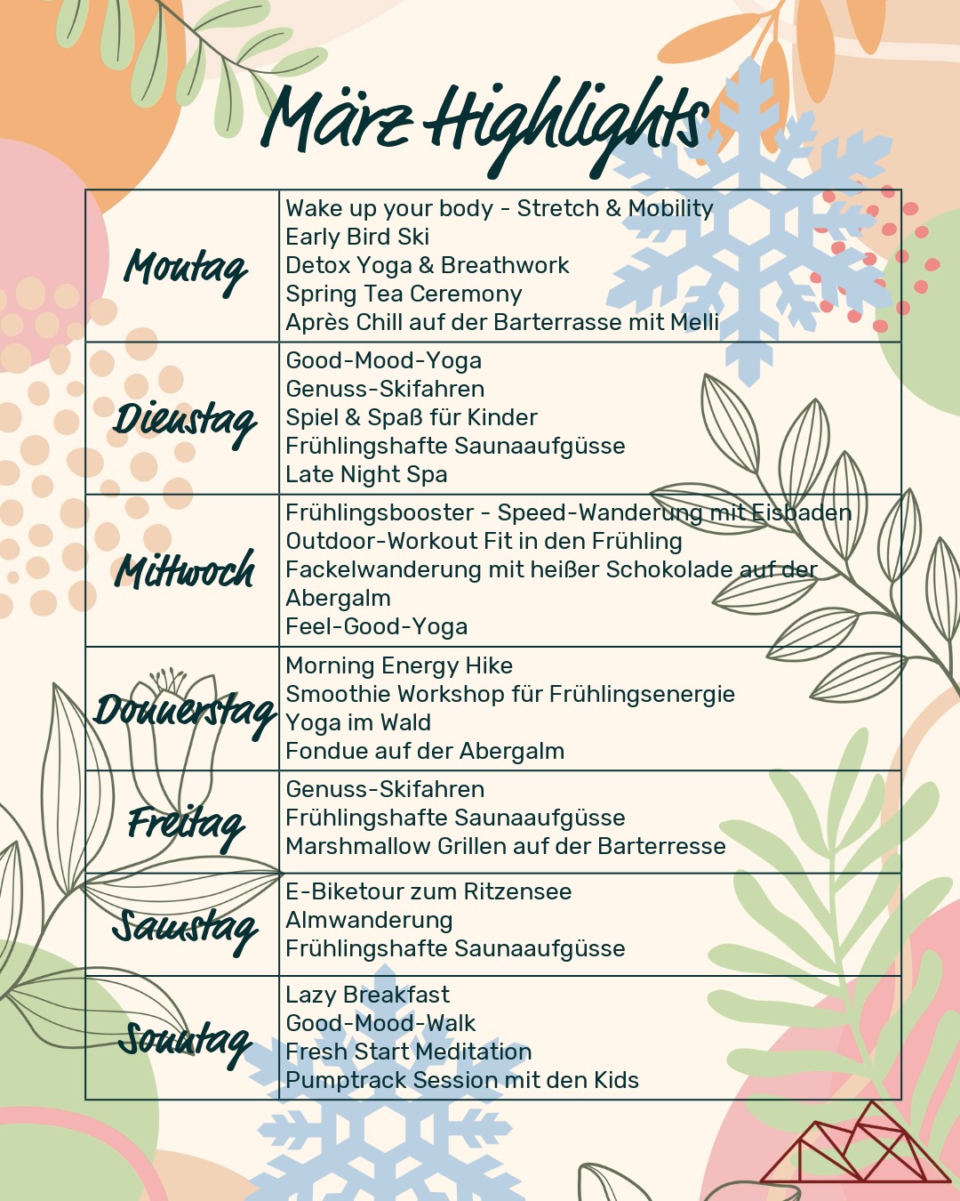 Sonnenskilauf am Berg trifft auf erste Frühlingsmomente im Tal – und dazwischen ein Wochenprogramm voller kleiner Genuss-, Aktiv- und Wellnesshighlights. Ganz gleich, wie sich das Wetter zeigt: Jeder Tag hält neue Good-Mood-Momente bereit. Eine Auszeit, die neue Energie schenkt und Lust auf den Frühling macht.